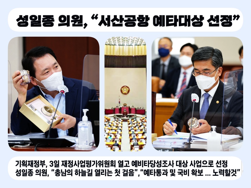 ▷ 기획재정부, 3일 재정사업평가위원회 열고 예비타당성조사 대상 사업으로 선정 ▷ 성일종 의원, “충남의 하늘길이 열리는 첫 걸음”, “예타 통과 및 국비 확보 위해 노력할 것” |