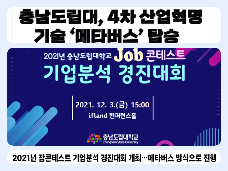 충남도립대학교(총장 김용찬)는 3일 ‘2021년 잡콘테스트 기업분석경진대회’를 메타버스 방식으로 진행한다고 밝혔다.