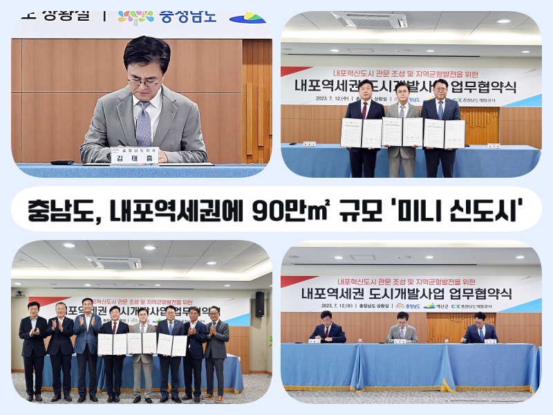 김태흠 지사는 12일 도청 상황실에서 최재구 예산군수, 정석완 충남개발공사 사장과 ‘내포혁신도시 관문 조성 및 지역균형발전을 위한 내포역세권 도시개발사업 업무협약’을 체결했다.