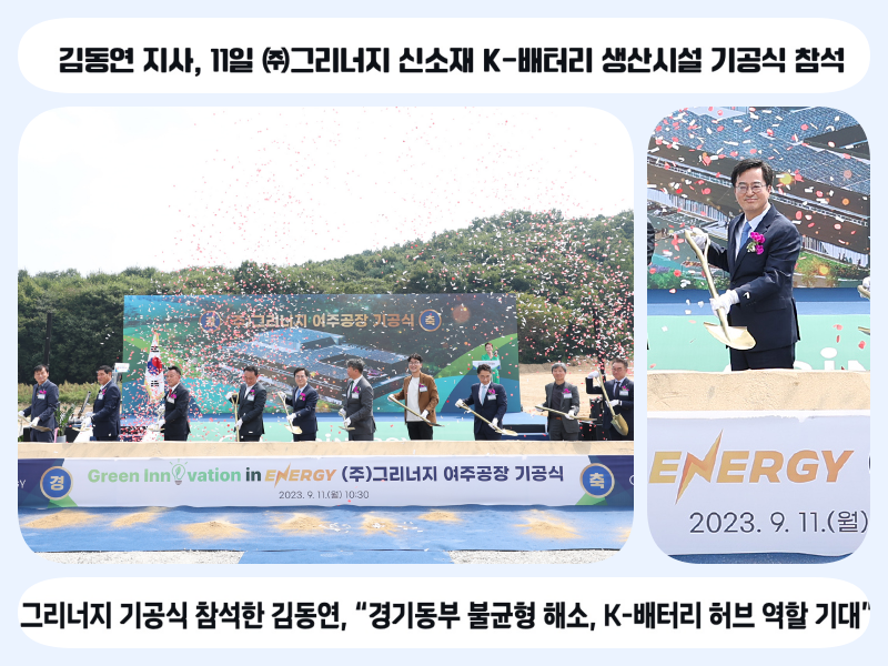 -그리너지 기공식 참석한 김동연, “경기동부 불균형 해소, K-배터리 허브 역할 기대” - 경기도, 규제중첩 여주에 K-배터리 생산라인 첫 삽. 투자유치 후 7개월 만에 투자 실현 성과 |