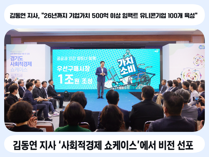 김동연 지사는 이날 2026년까지 추진할 사회적경제의 4가지 미래 비전으로 ▲임팩트 유니콘기업 100개 육성 ▲성공한 사회적경제 기업 모델의 프랜차이즈화 ▲공공·민간기업과 함께 ‘우선구매 1조 원 시장’ 조성 ▲사회적경제 조직 1만 2천 개로 확대 등을 제시했다.