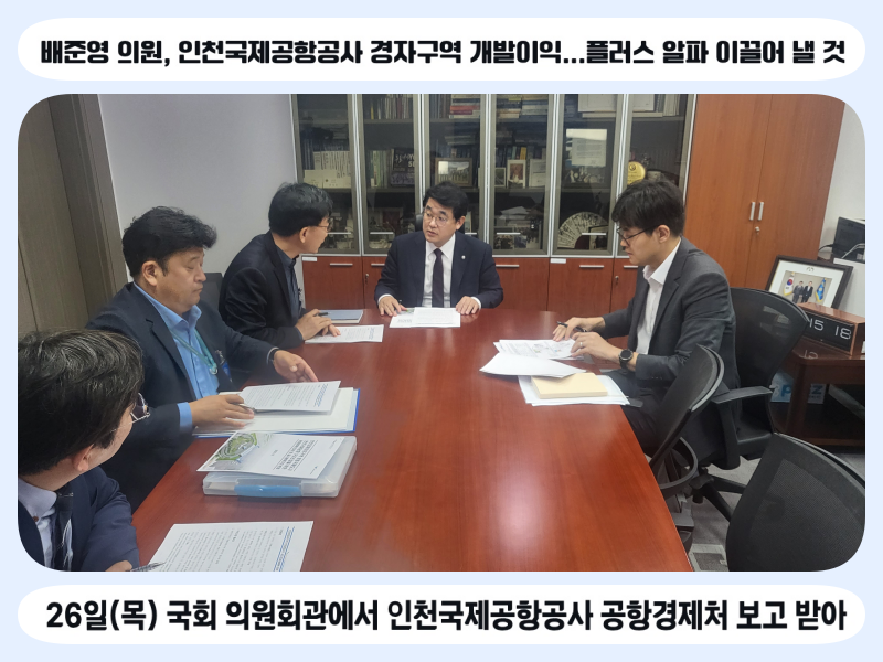 배준영 국회의원(인천 중구·강화군·옹진군)은 26일(목) 국회 의원회관에서 인천국제공항공사 공항경제처 백현송 처장 등 담당자로부터 ‘인천경제자유구역 인천공항지구 개발계획 변경 추진’관련 보고를 받고, 공사의 경자구역 개발이익 재투자가 약속대로 이행된다는 것을 확인했다.