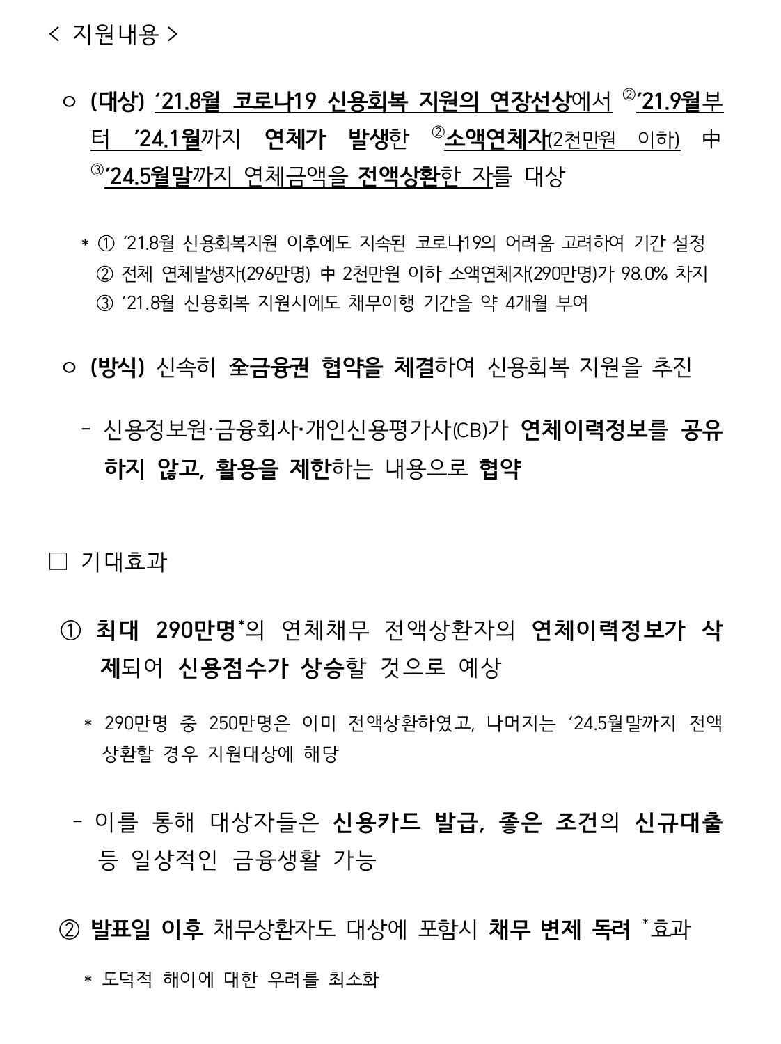 금융감독원이 과거 신용 사면 효과에 대해서 살펴본 결과 신용평점 상승으로 서민 및 소상공인의 카드 발급 등 금융접근성이 개선되고 신용 사면을 받은 차주의 장기 연체발생률이 비사면 차주 대비 1.1% 낮게 확인되어서 장기 연체 발생 억제 효과도 있는 등 긍정적 효과가 상당하다는 점이 이미 확인된 바 있으므로 이에 대해서 잘 검토 설명하도록 하겠습니다 제도 운영 관련해서 신용 사명이 신용 사명이 최종적으로 전액 상환한 분들에게만 대상이 되는 점 등을 국민들께 충분히 설명드려서 부정에 관한 일부의 우려가 커지지 않도록 준비하겠습니다