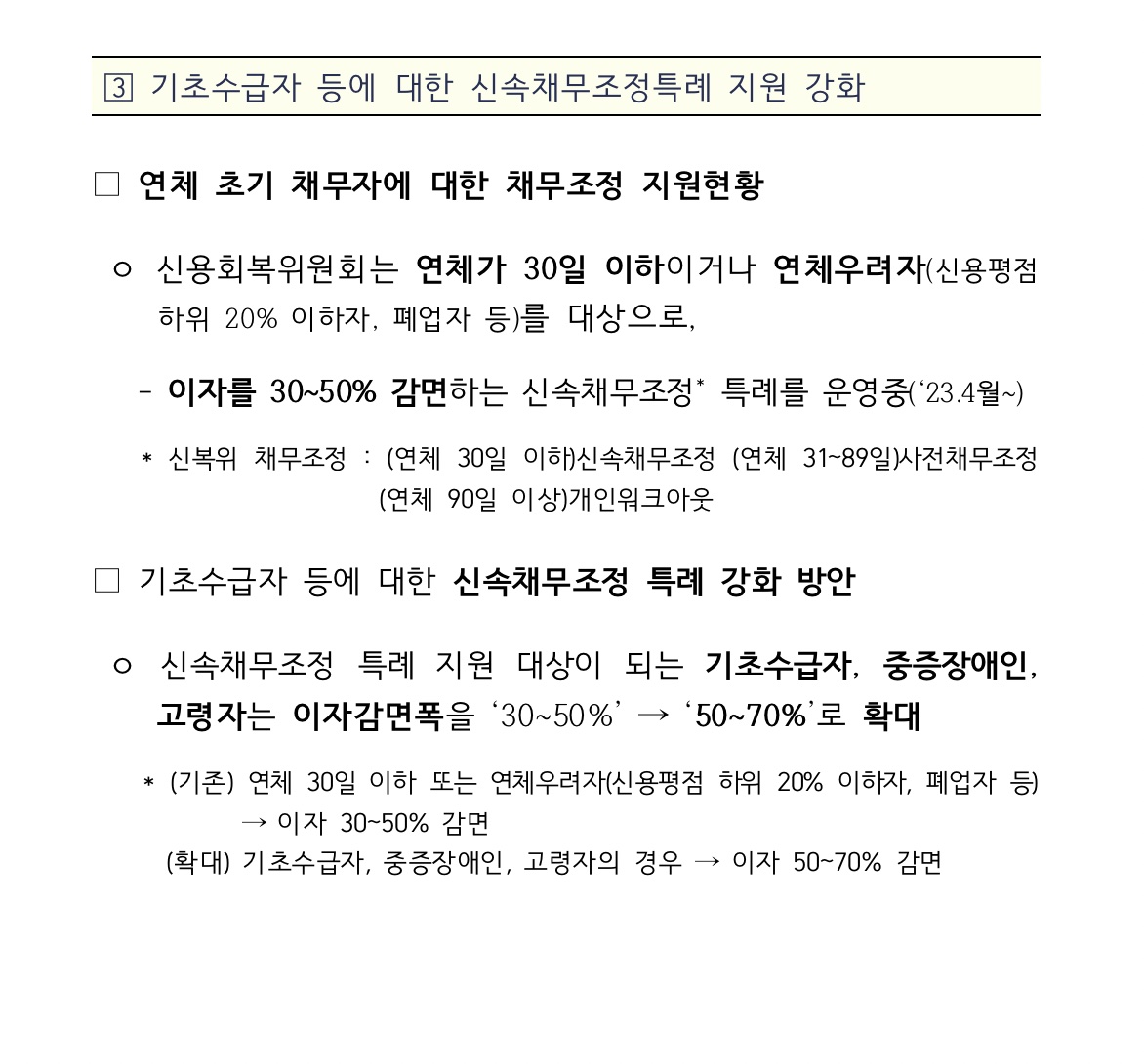 이 외에도 당정은 기초수급자에 대한 이자감면 등 신속 채무조정 특례를 확대하고, 이에 따라 이자 감면의 폭을 50~70%로 확대하여 기초수급자 5000명의 상환 부담을 경감할 것으로 예상되고 있다.