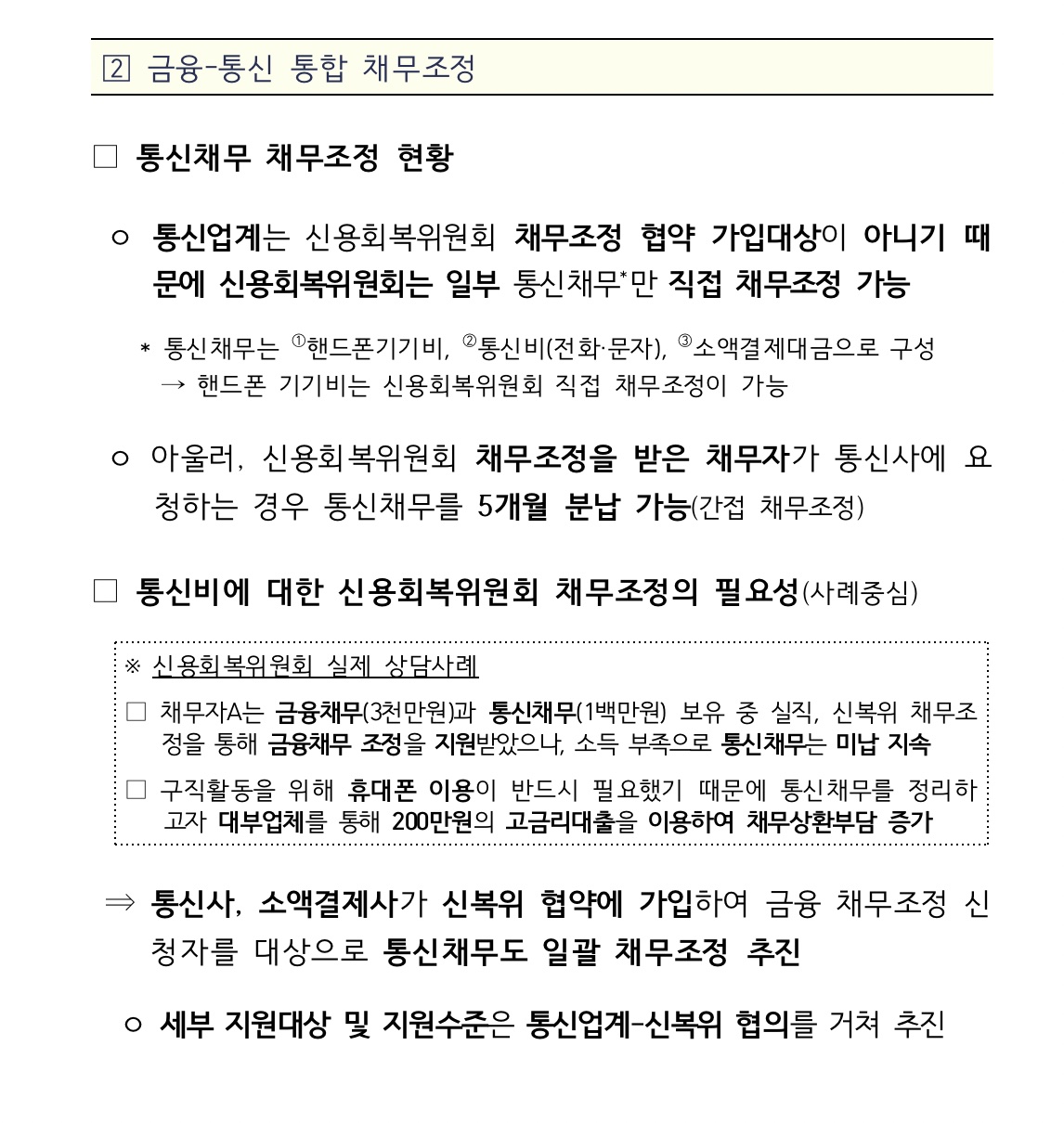 또한, 통신비는 생활에 밀접한 부분이기 때문에 서부문에서 신용회복 지원을 통해 어려움을 겪는 분들이 신속하게 회복할 수 있도록 지원하려 합니다. 오늘의 논의를 통해 이런 어려운 상황에서 신용회복을 위한 다양한 지원 방안을 논의하고, 긍정적인 변화를 이끌어내기를 기대합니다. 감사합니다."