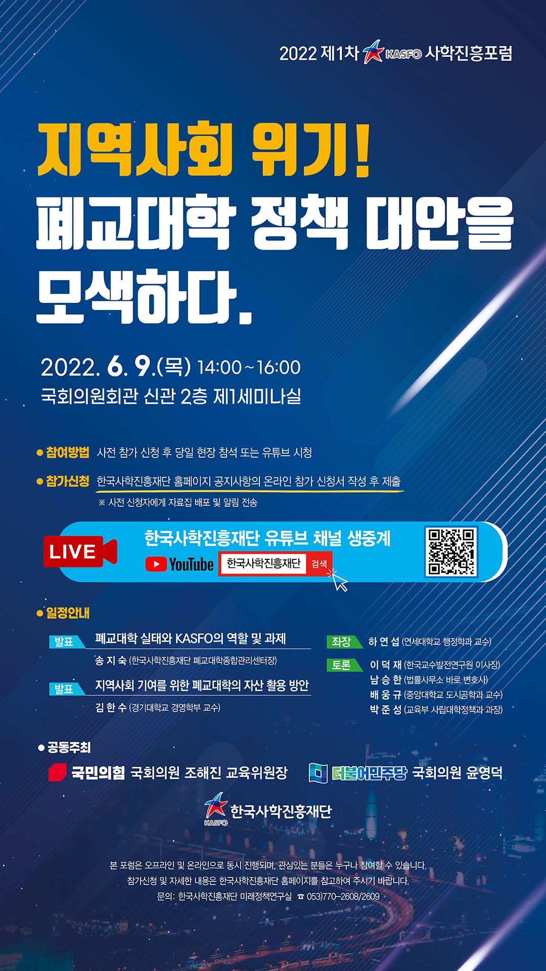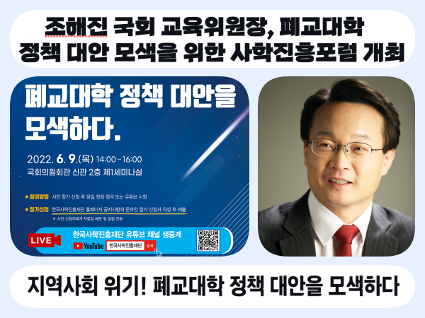 국회 교육위원장인 조해진 의원(국민의힘, 밀양·의령·함안·창녕)은 국회 윤영덕 의원실, 한국사학진흥재단(이사장 홍덕률)과 함께 오는 9일 국회 의원회관 제1세미나실에서 ‘지역사회 위기! 폐교대학 정책 대안을 모색하다’를 주제로 사학진흥포럼을 개최한다.