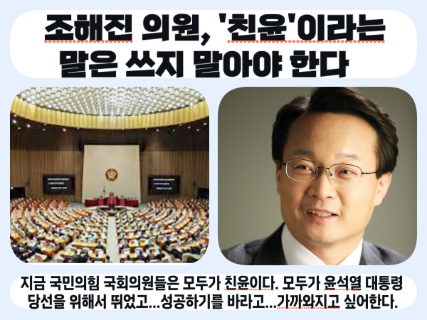 '친윤'이라는 말은 쓰지 말아야 한다. 지금 국민의힘 국회의원들은 모두가 친윤이다. 모두가 윤석열 대통령 당선을 위해서 뛰었고, 윤석열 정부가 성공하기를 바라고, 윤 대통령과 가까와지고 싶어한다.