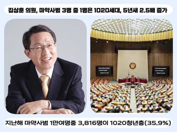 국회 기획재정위원회 소속인 김상훈 의원(국민의힘, 대구 서구)이 경찰청으로부터 제출받은‘최근 5년간 마약류 사범 검거 현황’자료에 따르면, 2017년 검거된 마약사범 8,887명중 20대 청년과 10대 청소년이 차지하는 비율은 각각 1,478명(16.6%), 69명(0.8%)였던 반면, 2021년에는 10,626명 중 20대 3,507명(33%), 10대 309명(2.9%)로 5년새 2.5배나 늘어났다.