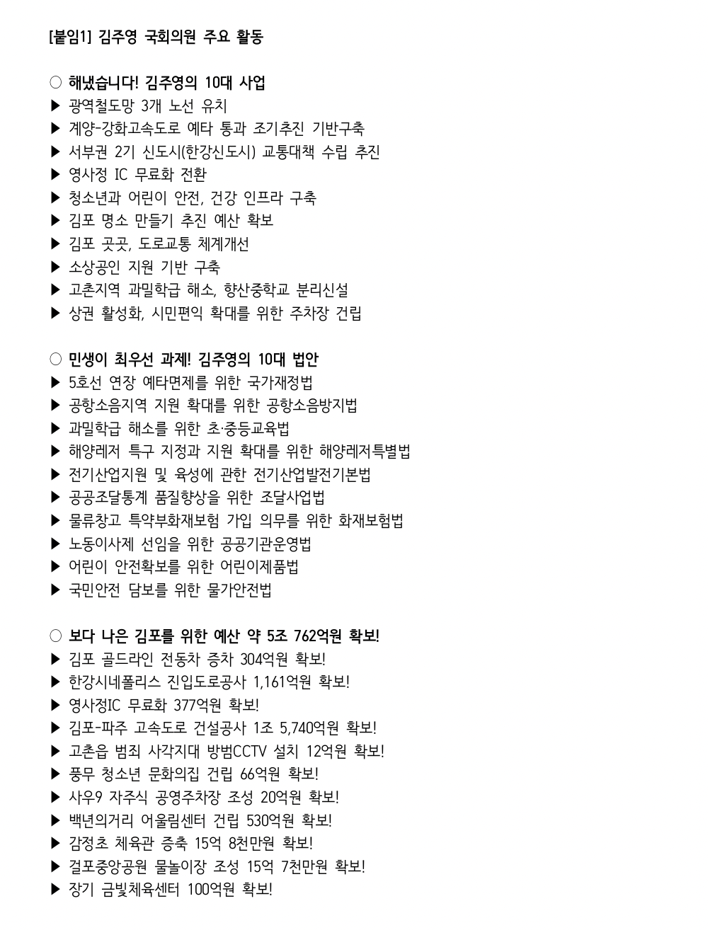 김 후보는 신속한 서울지하철 5호선 김포연장 사업 추진을 위한 예비타당성조사 면제 법안을 발의해 민주당 당론으로 이끌어낸 바 있다. 5호선 노선 중재 당시 감정역(환승) 신설을 확보해 낸 김 의원은 지난 1월19일 국토부 대도시권광역교통위원회의 5호선 연장 노선 중재안 발표 직전까지 협의를 거쳐 추가역 신설의 기반을 마련하고, 대광위 최종 발표안에 포함시켰다.