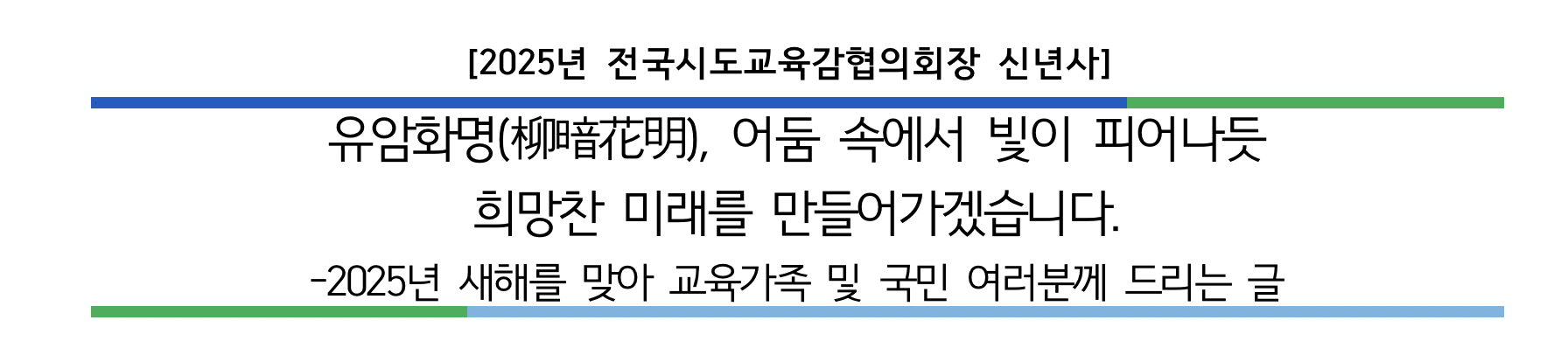 어둠 속에 빛이 피어난다는 ‘유암화명(柳暗花明)’처럼 불확실한 현재와 불안한 미래 속에서도 교육의 본질을 지키며 희망찬 미래를 만들어가야 합니다. 전국시도교육감협의회는 교육가족과 함께 힘과 마음을 모아 대한민국 교육 발전과 밝은 미래를 위해 최선을 다하겠습니다.