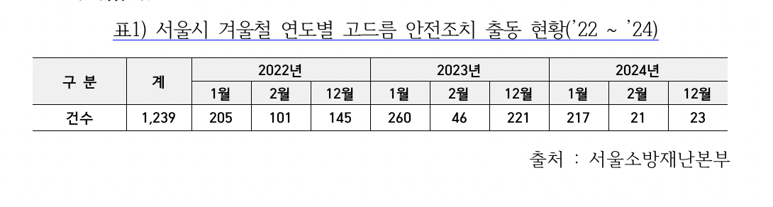 서울특별시 소방재난본부(본부장: 황기석)는 겨울철 생활안전 정보 제공을 위해 최근 3년간 겨울철 고드름 안전조치 출동 관련 통계를 분석하여 10일(금) 발표했다.