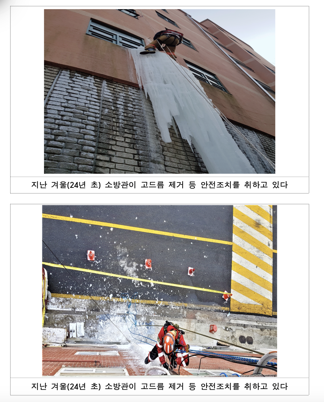 시 소방재난본부 관계자는 “당분간 추위가 반복될 수 있는 만큼 건물 외부에 고드름 발생 여부를 꼭 확인해야 한다”며 “높은 곳에 생긴 대형 고드름 등은 무리하게 제거하지 말고 119로 신고해 주셔야 한다”고 전했다.