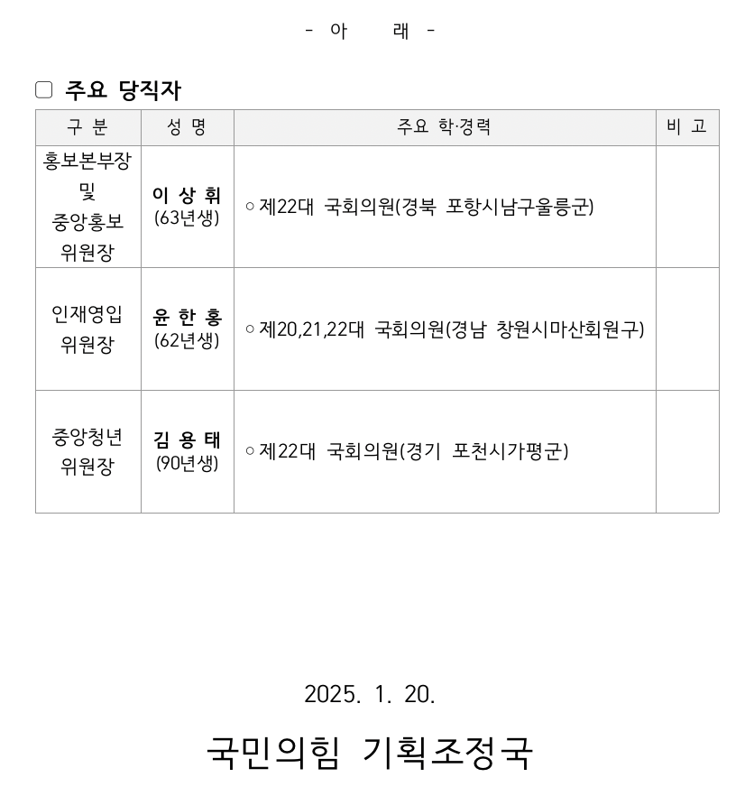 국민의힘은 금일(1.20. 월) 제9차 비상대책위원회의에서 아래와 같이 결정하였음을 알려드립니다.