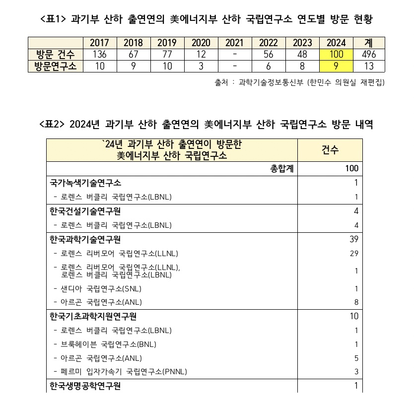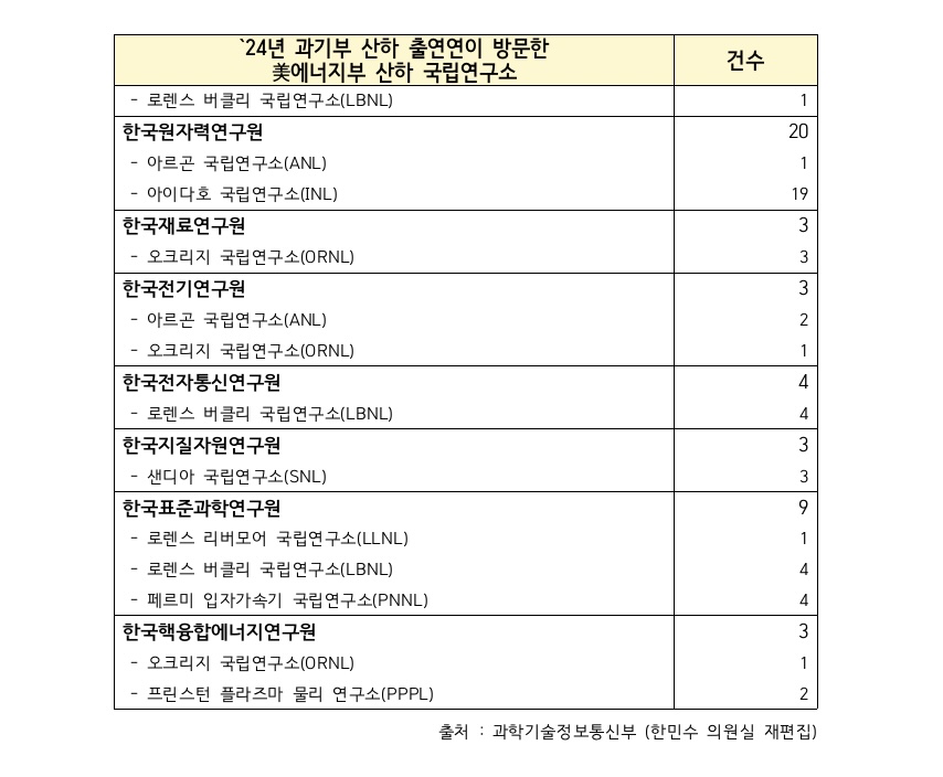국회 과학기술정보방송통신위원회 소속 한민수 의원(더불어민주당, 서울강북구을)이 과학기술정보통신부(이하 과기부)로부터 제출받은 자료에 따르면, 2024년 한 해 동안 과기부 산하 총 12곳의 정부출연연구기관 소속 연구자들이 DOE 산하 9곳의 국립연구소를 공식적으로 방문했다.