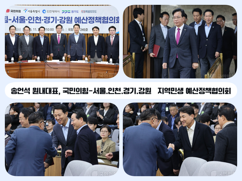 송언석 원내대표는 2025. 11. 2.(일) 10:00, 국민의힘-서울.인천.경기.강원 지역민생 예산정책협의회에 참석했다. 주요내용은 다음과 같다.