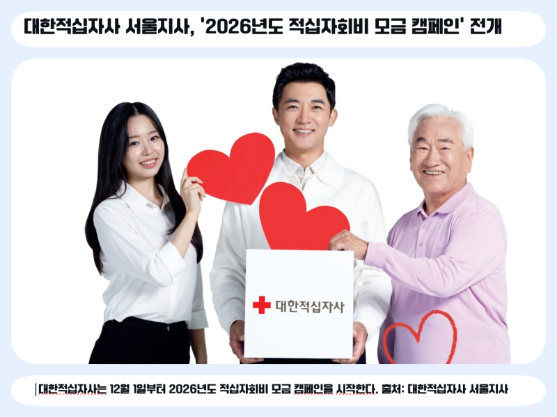 대한적십자사 서울특별시지사(회장 권영규)는 12월 1일부터 ‘2026년도 적십자회비 모금 캠페인’을 시작한다고 밝히며, 시민들의 적극적인 참여와 관심을 요청했다.