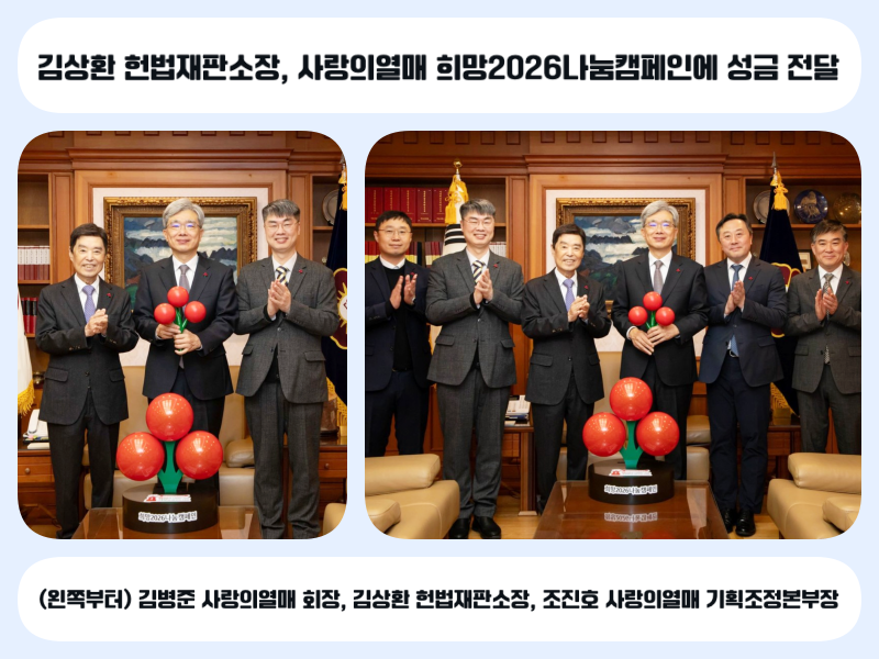 김상환 헌법재판소장은 오늘 12월 3일 오전 연말연시를 맞아 사랑의열매 사회복지공동모금회(회장 김병준) 이웃돕기 캠페인 ‘희망2026나눔캠페인’에 성금을 전달했다.