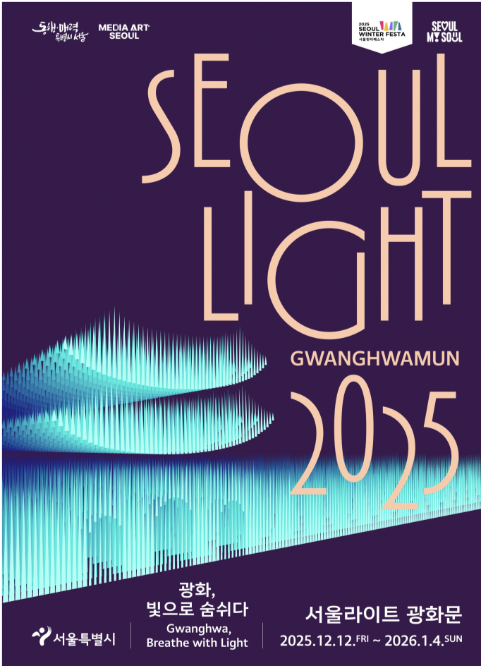 올해로 4회째 개최되는 서울라이트 광화문은 ‘광화, 빛으로 숨쉬다’ (Gwanghwa, Breathe with Light)를 주제로 ▴광화문 미디어파사드 전시 ▴운수대통로 빛조형 작품 ▴세종 파빌리온 미디어아트 등 16명의 아티스트들이 참여하여 다채로운 볼거리를 제공하며, 2026 신년 카운트다운 행사도 함께 진행된다.