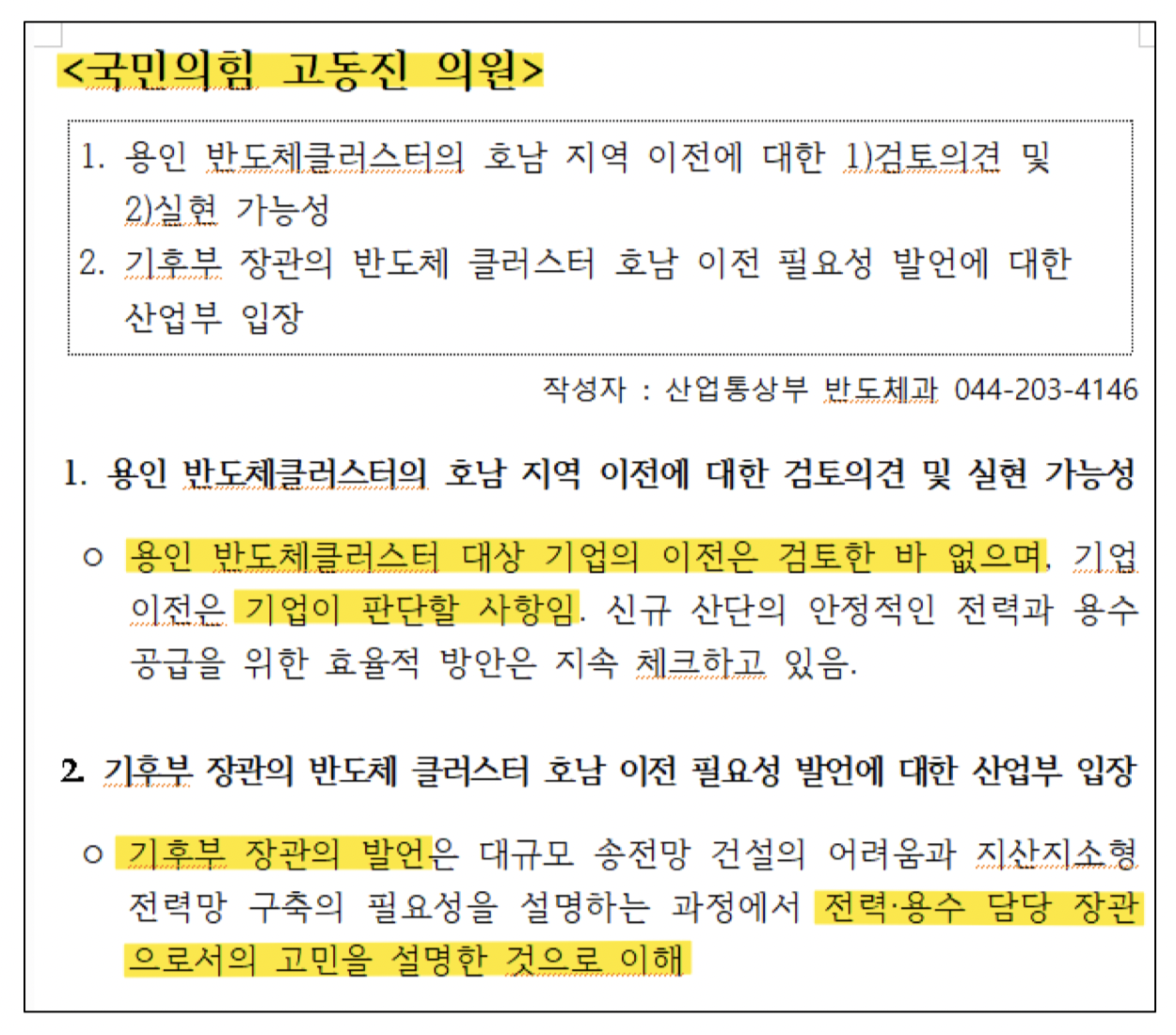 국회 행정안전위원회 소속 고동진 국회의원(국민의힘, 서울 강남구병)은 용인 반도체 클러스터의 주무부처인 산업통상부가 ‘새만금 등 호남 이전에 대하여 검토한 바 없으며, 이전 문제는 기업이 자체적으로 결정할 사항’이라고 공식 보고했다는 사실을 공개했다.