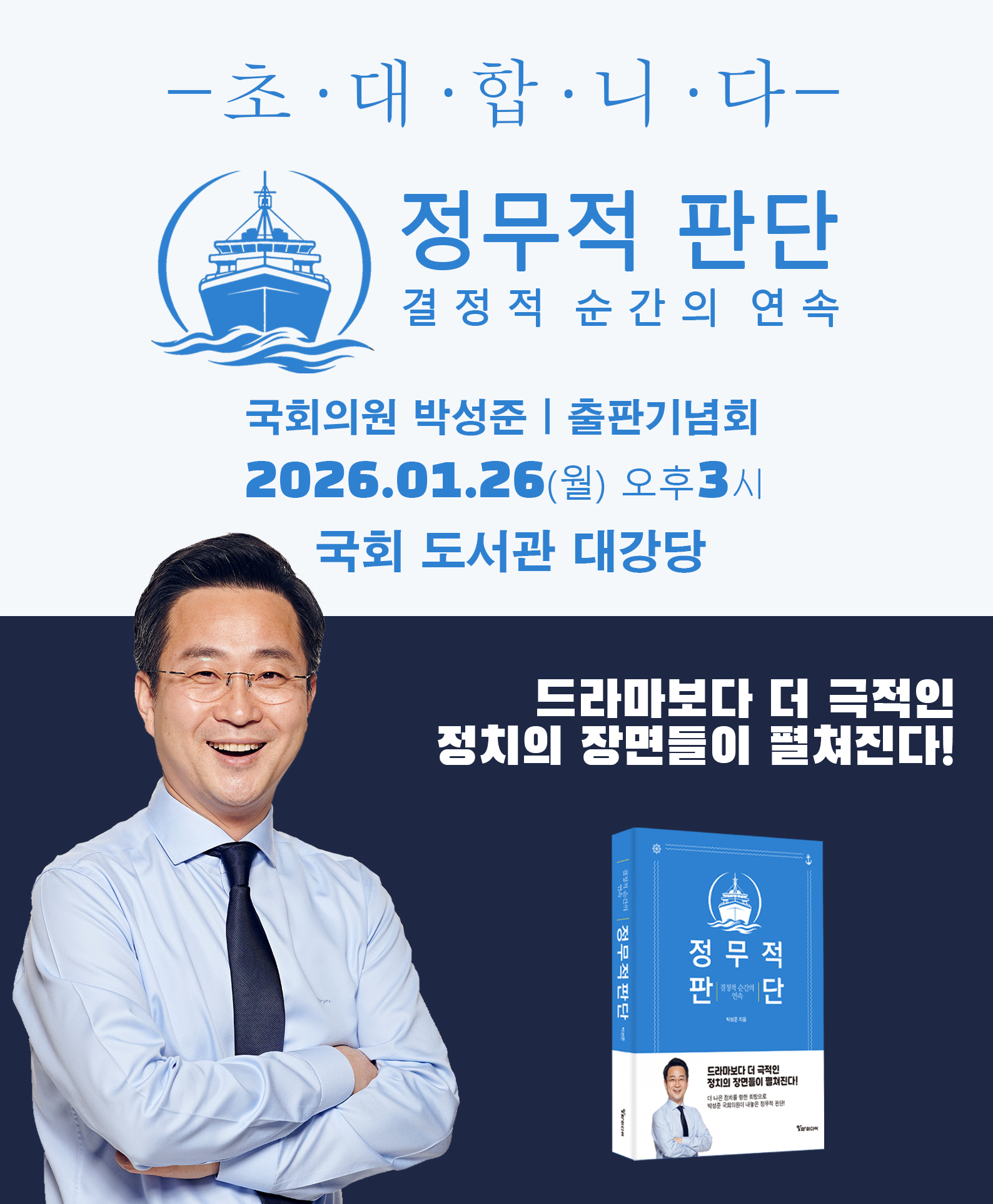 한편, 박성준 의원의 『정무적 판단』 출판기념회는 오는 2026년 1월 26일(월) 오후 3시, 국회 도서관 대강당에서 열릴 예정이다. 이번 출판기념회에서는 책의 주요 내용과 함께 정치 현장에서의 판단과 책임, 그리고 앞으로의 정치가 나아가야 할 방향에 대한 메시지가 공유될 계획이다.