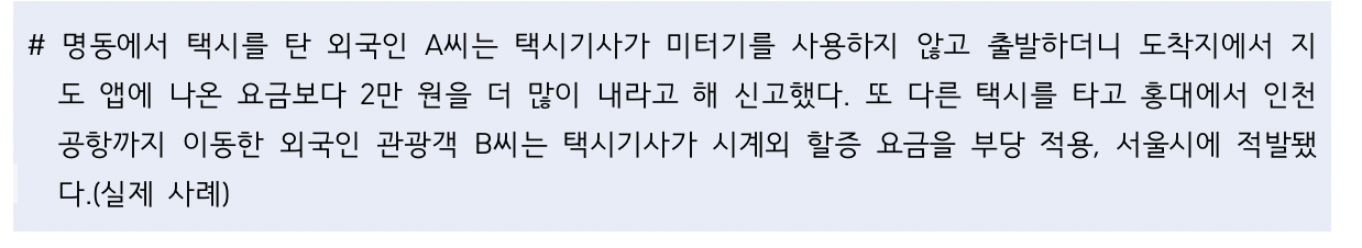 □ 서울시는 외국인 관광객 택시 이용 불편 중 가장 많은 비중을 차지한 ‘부당요금 근절’을 위해 택시 영수증에 영문을 병기하고 할증 여부도 표시한다고 밝혔다. 또 플랫폼사별로 각기 다르게 표시됐던 용어도 ▴미터기 요금(Meter Fare) ▴통행료(Toll fee)로 통일한다.