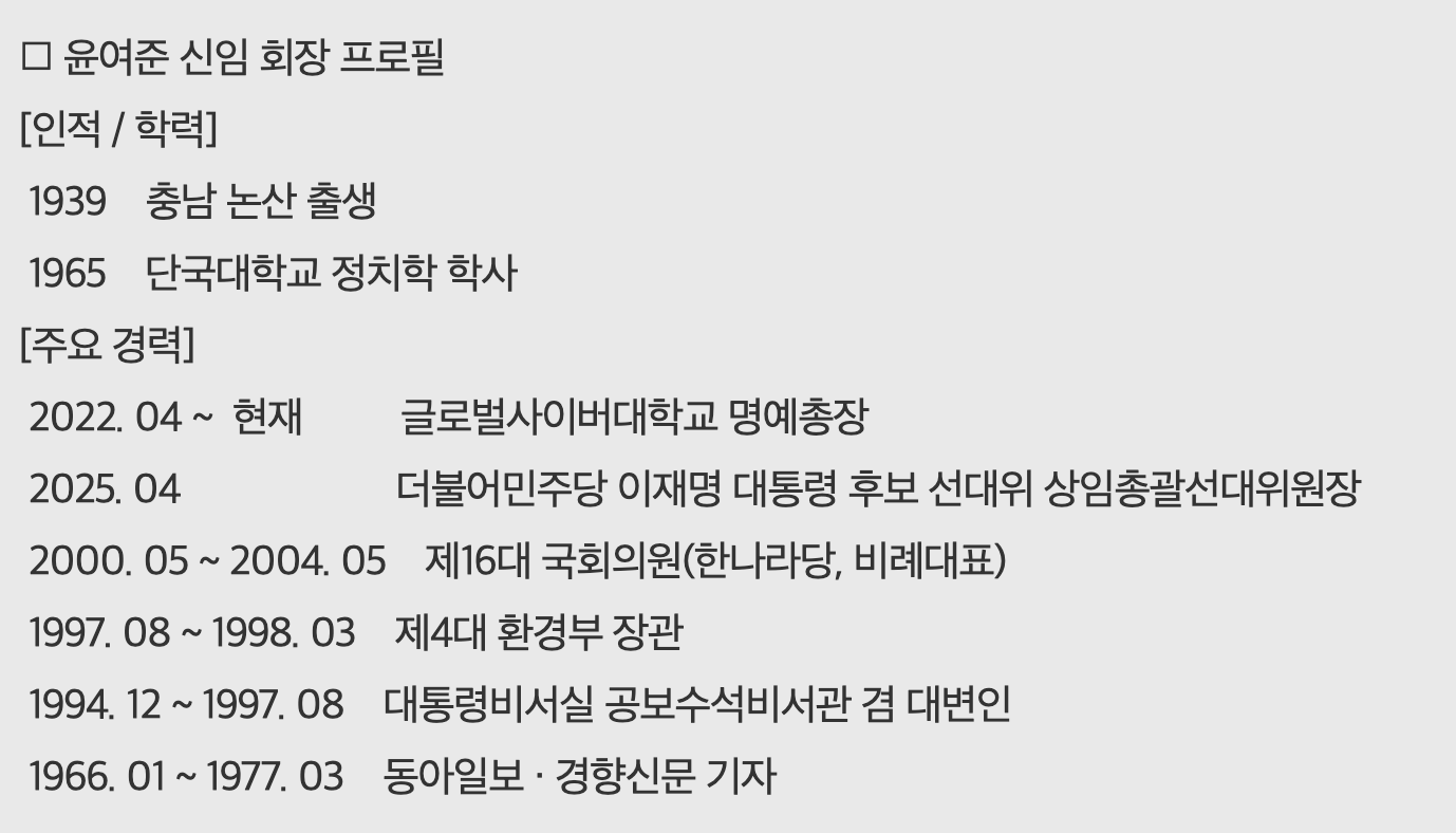 1997년 제4대 환경부 장관으로 입각한 후 제16대 국회의원과 여의도연구소장(제4대·6대) 을 지냈으며, 현재는 윤여준정치연구원 원장과 글로벌사이버대학교 명예총장으로 재직하고 있다. 60년 간 언론·외교·행정·입법·교육·정치 분야를 두루 망라한 풍부한 경륜을 지니고 있다.