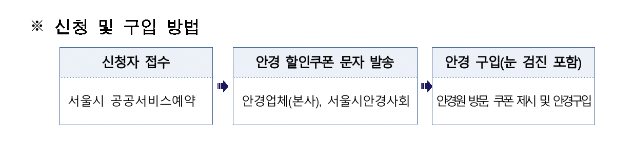 신청 시 원하는 안경업체를 선택해 신청할 수 있으며, 인원 제한은 없다. 대상자에게는 신청한 안경업체에서 사용할 수 있는 안경 할인쿠폰이 휴대전화 문자를 통해 발급된다. 쿠폰 사용기한은 발급일로부터 6개월이다.
