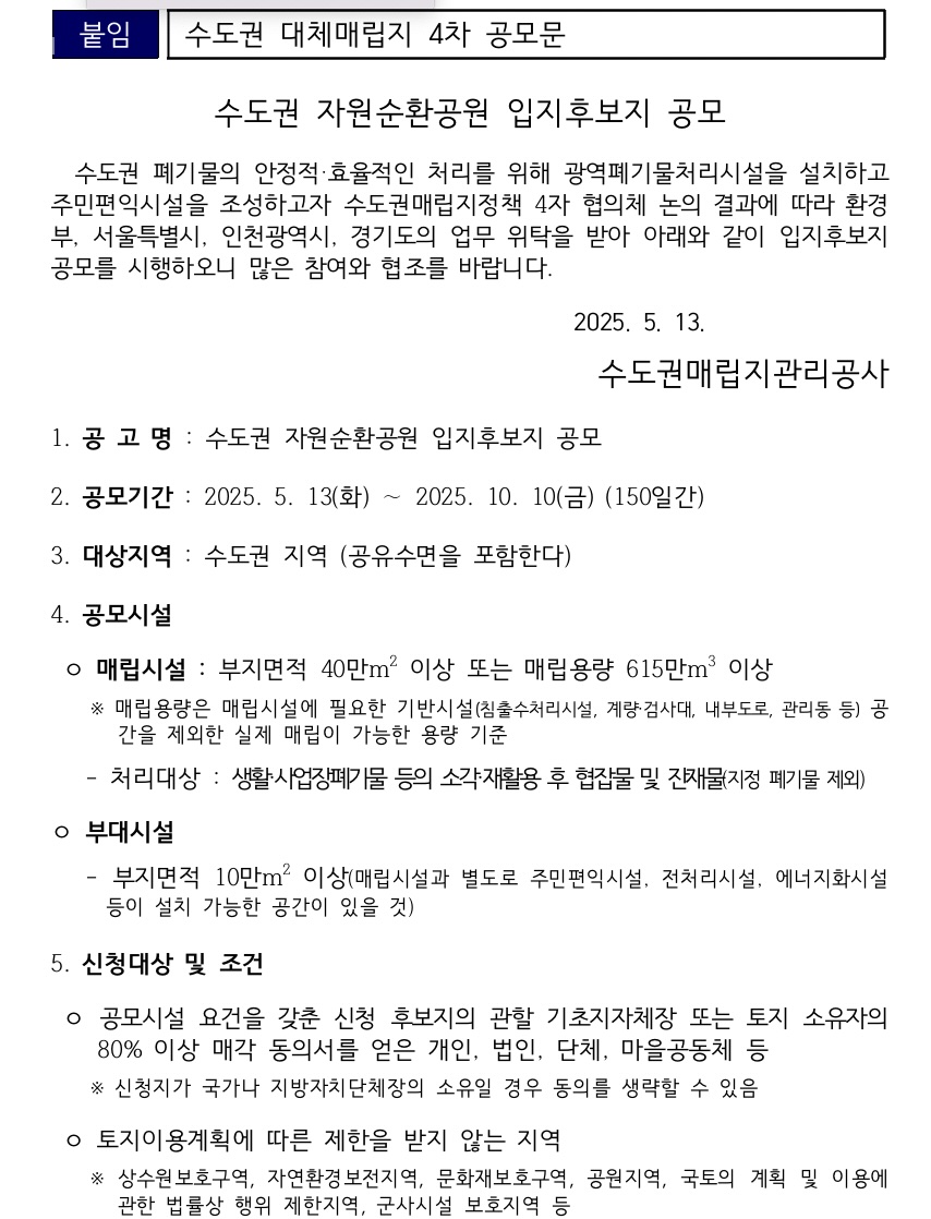 수도권 대체매립지 확보를 위한 자원순환공원 입지후보지 4차 공모 시행 |