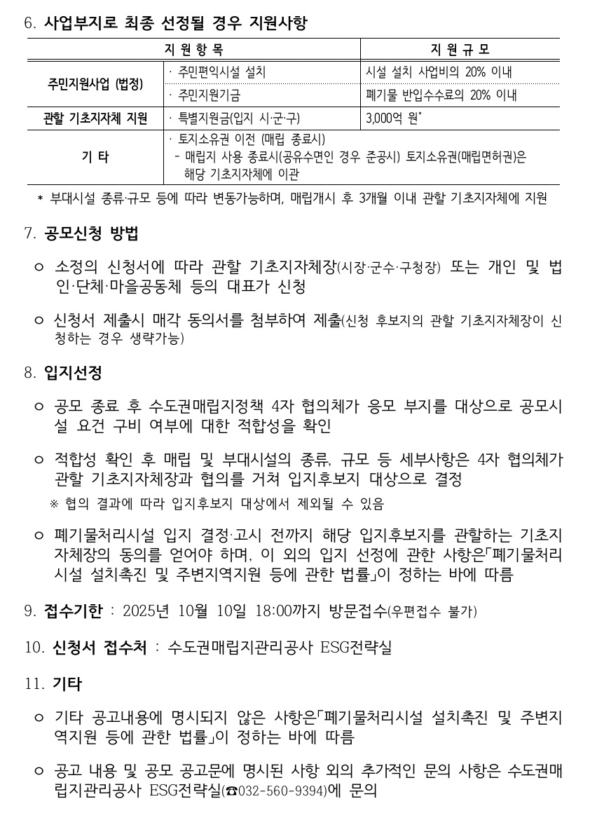 4자 협의체는 장기적인 수도권 폐기물의 안정적 처리를 위해 부지 규모가 크고 전처리시설, 에너지화시설 등 다양한 부대시설이 입지가능할 경우 특별지원금을 대폭 상향할 계획이다.