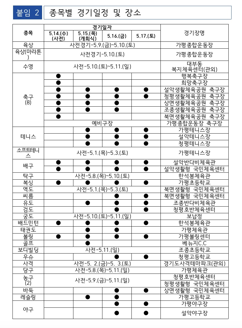 전국대회 등을 고려해 5월 1일 소프트테니스, 역도, 사격을 시작으로 육상과 수영 등 11개 종목은 사전경기로, 축구와 테니스 등 16개 종목은 본 대회에서 진행하는 등 총 27개 종목에서 실력을 겨룬다. 시군 인구수를 기준으로 상위 16개 시군을 1부, 하위 15개 시군을 2부로 나눠 운영한다.