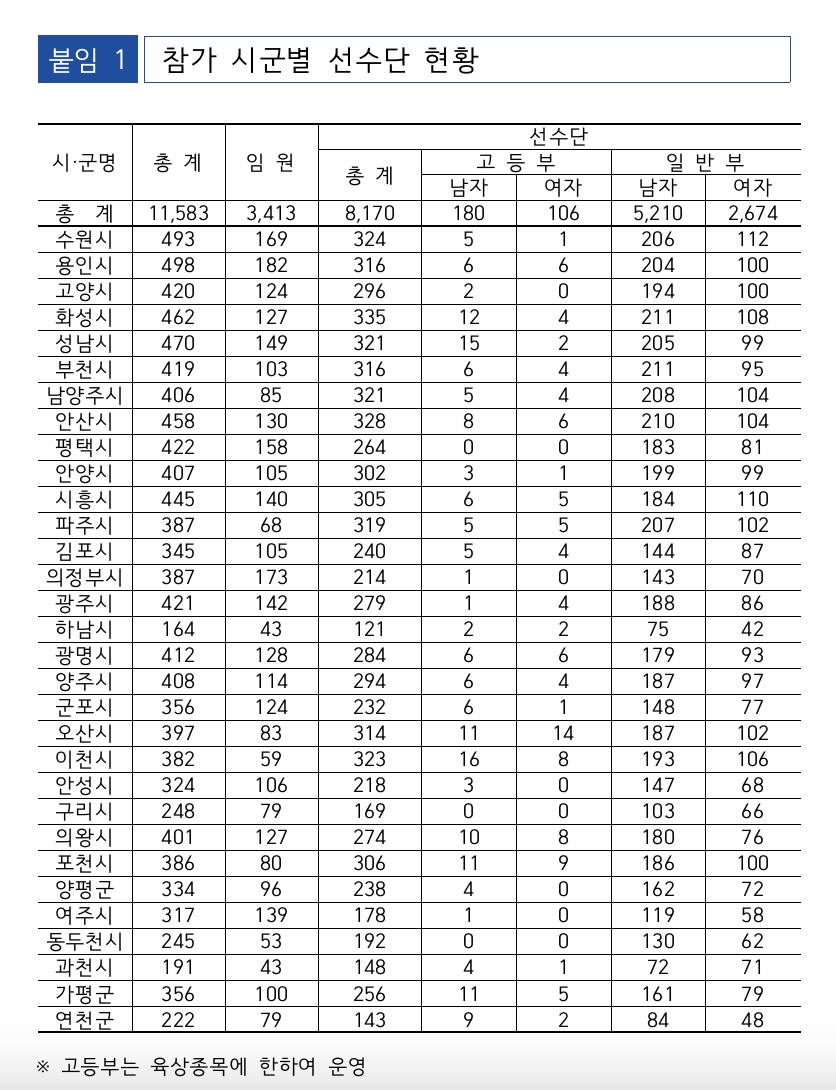 ○ 김동연 지사 15일 경기도체육대회 개회식 참석 - 도내 31개 시군 1만2천여 명 참가, 27개 종목에서 기량 뽐내 - 31개 시군 1만 1천583명(선수 8천170명, 임원 3천413명) 시군 명예를 걸고 열전 돌입 |