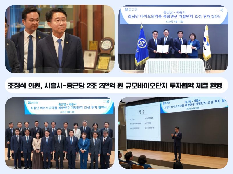 조정식 국회의원(더불어민주당, 시흥을)은 6월 10일(화) 서울 종근당 본사에서 열린 시흥시-종근당 ‘최첨단 바이오의약품 복합연구 개발단지 조성’투자협약 체결식에 참석해, 시흥시와 종근당 간 2조 2천억 원 규모의 투자협약 체결에 함께 했다.