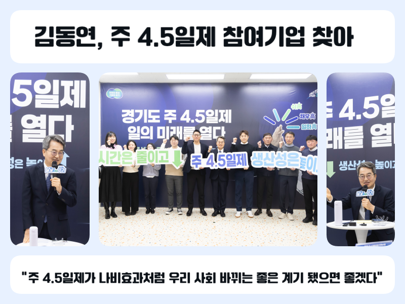 김동연 경기도지사가 “주 4.5일제가 나비효과처럼 우리 사회가 바뀌는 좋은 계기가 됐으면 좋겠다”며 적극적인 지원의사를 재차 밝혔다.