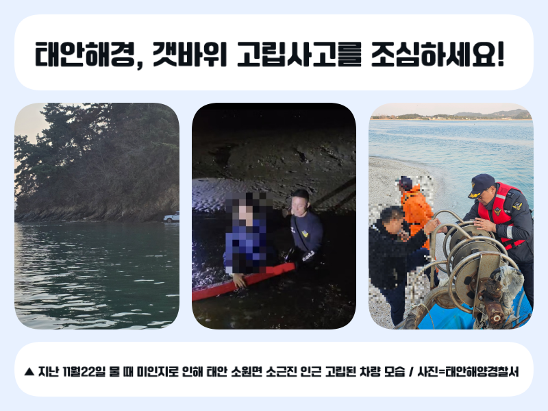 태안해경 관계자는 연안사고를 예방하기 위해 ‣물때 시간을 꼭 확인하고 2인 이상 함께 활동 ‣갯바위, 방파제, 테트라포드 등 고립·익수 우려가 높은 장소에는 출입 자제 ‣모든 연안활동 시 구명조끼 착용 등 안전수칙을 준수할 것을 당부하였다.
