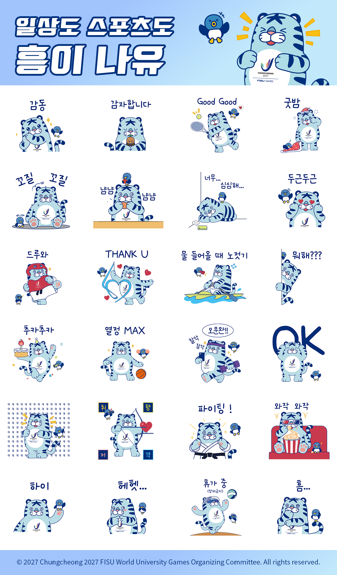 2027 충청 유니버시아드대회 조직위원회(위원장 강창희, 이하 조직위)는 대회 개최 D-500일을 기념해 마스코트 ‘흥이&나유’ 네이버 스티커를 19일 자정부터 네이버를 통해 1년간 무료 배포한다고 밝혔다.