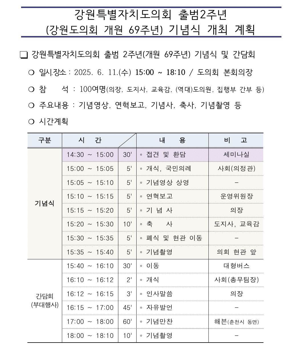 이번 기념식은 전현직 도의원, 김진태 도지사, 신경호 교육감 등이 참석한 가운데 강원특별자치도의회의 지난 발자취를 돌아보고, 지역 발전과 도민 행복을 위한 새로운 도약을 다짐하는 자리로 마련된다.