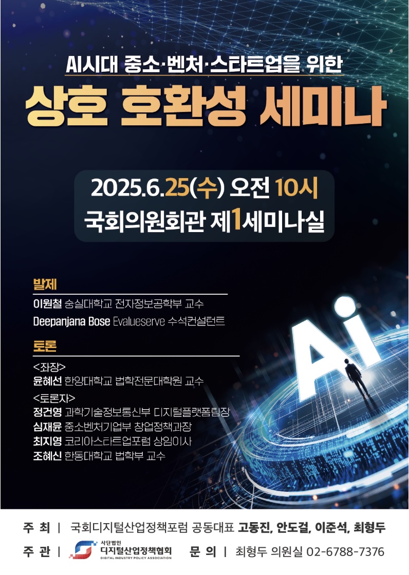 25 일 국회의원회관 제 1 세미나실에서 ‘AI 시대 중소 · 벤처 · 스타트업을 위한 상호 호환성 세미나 ’ 를 개최한다고 23 일 밝혔다 .