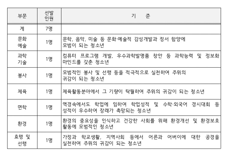 ① 7개 부문(문화예술, 과학기술, 봉사, 체육, 면학, 환경, 효행 및 선행) 7명 선발 ② 6월 23일 ‘강원특별자치도 청소년 육성위원회’ 심사를 거쳐 선발 ③ 8월 9일(토) 오후 2시, 시상식에서 강원특별자치도지사 상패 수여 |