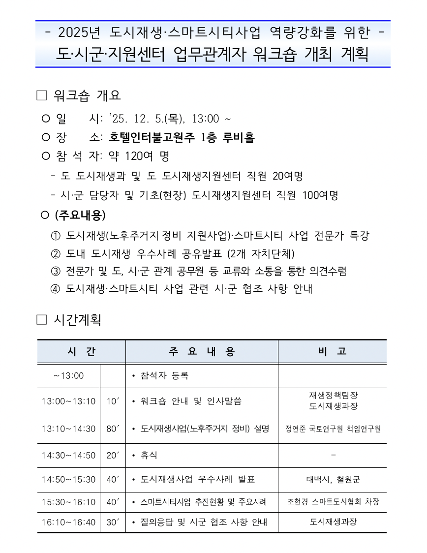 이번 워크숍은 도시재생사업 이해도 제고와 도내 우수사례 공유를 통해 지역 맞춤형 도시재생 모델을 발굴하기 위해 마련되었으며, 주요 내용은 ▲ 도시재생사업 및 노후주거지 정비사업 이해 ▲ 스마트시티 사업 추진 동향 및 주요 사례 전문가 특강 ▲ 도내 도시재생 우수사례 시군 공유 ▲ 2026년 도시재생사업 추진을 위한 시군 협조 사항 안내 등으로 구성된다.