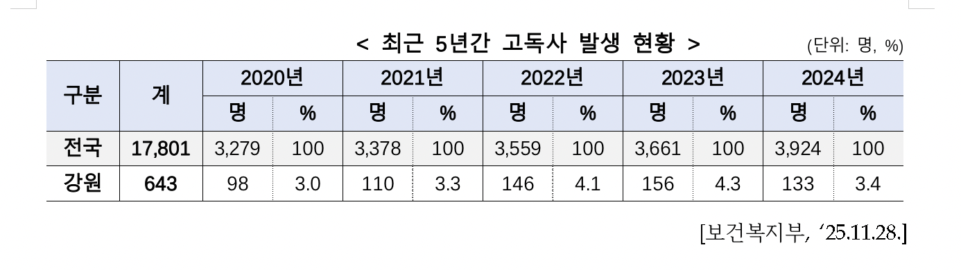 한편, 최근 5년(‘20~’24년)간 도내 고독사 사망자 수는 643명으로 전국 고독사