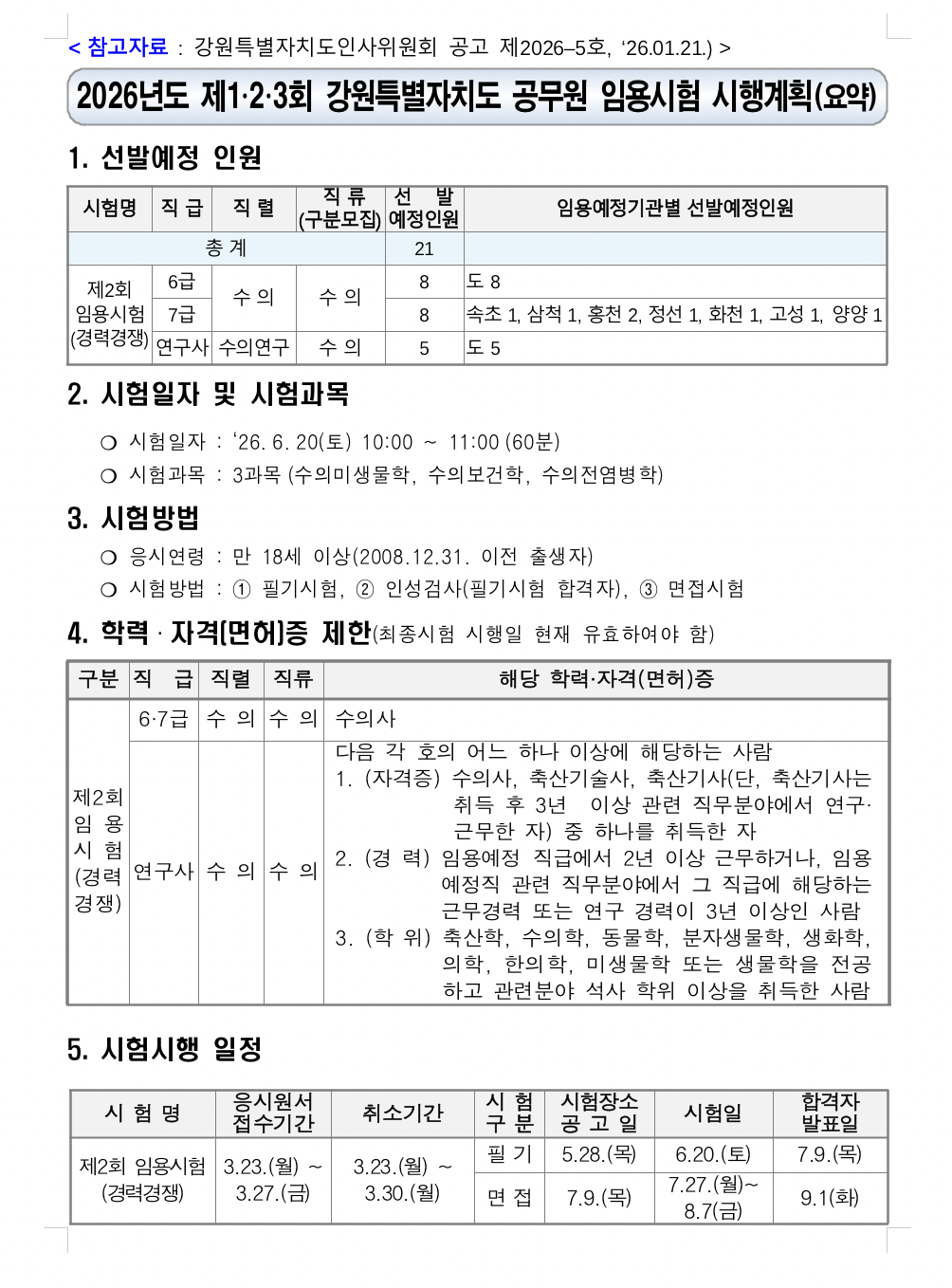 안재완 강원특별자치도 동물방역과장은 “수의직 공무원은 가축 방역뿐 아니라 축산물 위생과 동물복지 등 동물과 사람의 건강을 지키는 중요한 역할을 수행하는 직무”라며 “공공 수의행정 분야에 뜻을 가진 우수한 인재들의 많은 관심과 지원을 기대한다”고 말했다.