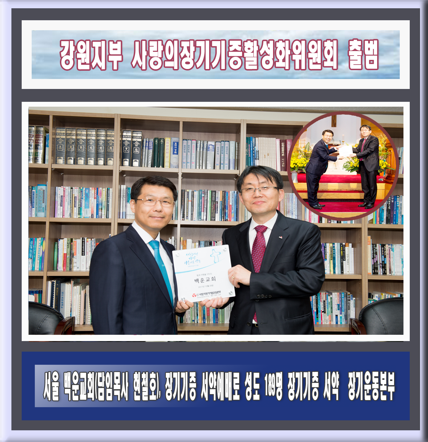 - 서울 백운교회(담임목사 현철호), 장기기증 서약예배로 성도 189명 장기기증 서약 -10월 29일 주일, 10교회 성도 481명 장기기증 서약 |