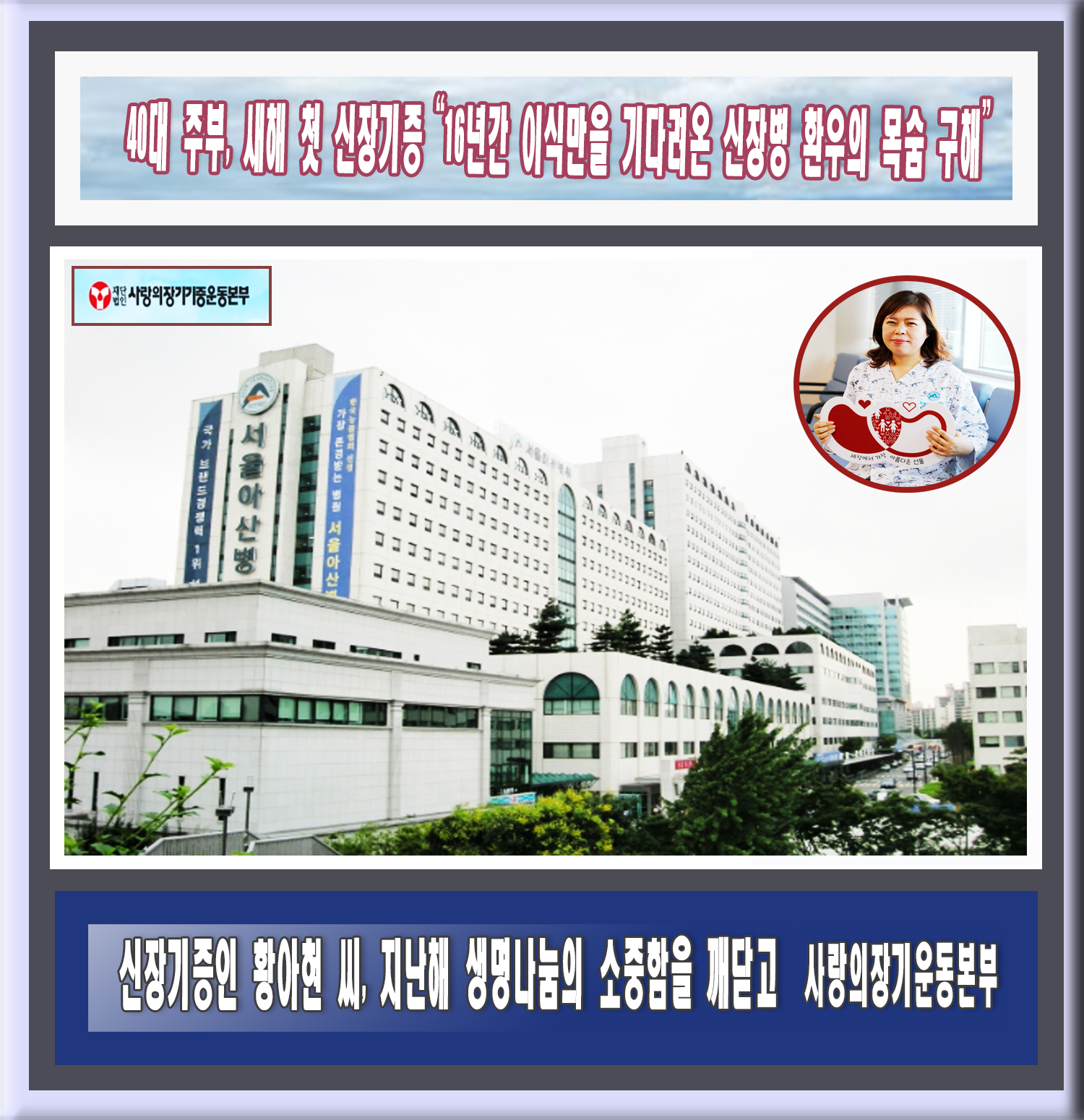 - 25일, 44세 주부 생면부지 타인위해 자신의 신장하나 기증해 - 신장기증인 황아현 씨, 지난해 생명나눔의 소중함을 깨닫고 본부를 통해 장기기증 서약해 - 황 씨, 사랑의장기기증운동본부 창립 27주년 맞아 탄생한 967번째 신장기증인 - 황 씨에게 새 생명 선물 받는 이는 16년간 투병생활 이어온 50대 주부 |