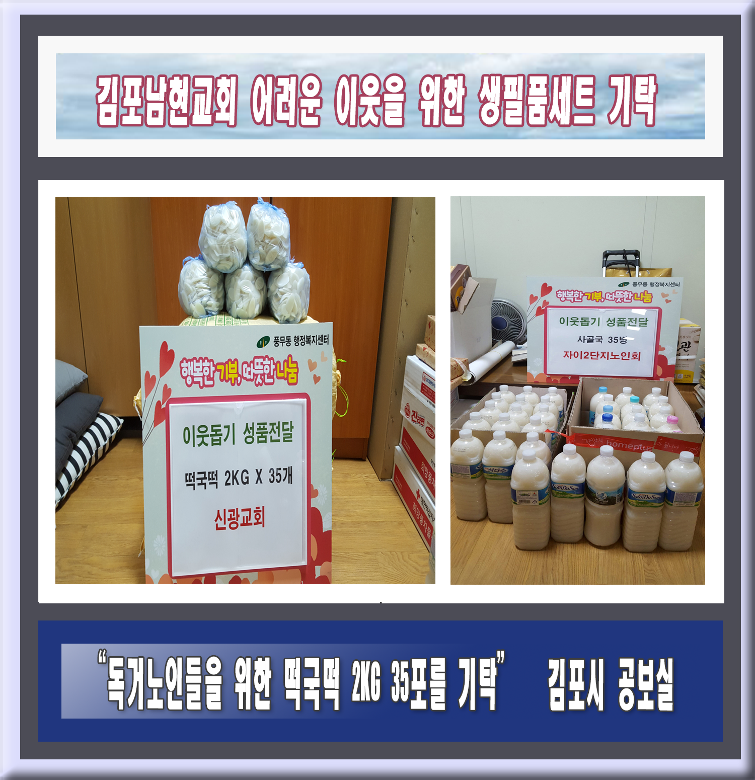 풍무동에 소재한 신광교회(목사 오양섭)는 설명절을 앞두고 독거노인들을 위한 떡국떡 2KG 35포를 기탁했다. 신광교회에서는 지난 연말에도 관내의 저소득 독거노인을 위해 생필품을 기부하여 이웃사랑을 실천해 오고 있다.