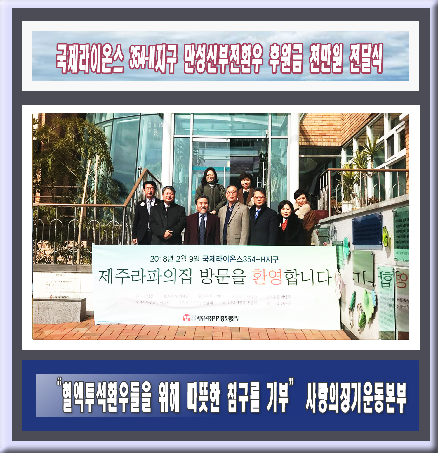 사랑의장기기증운동본부(이사장 박진탁, 이하 본부)는 지난 2월 9일 금요일, 국제라이온스협회 354―H지구(총재 임상철, 이하 354-H지구)가 제주 라파의집에서 특별한 전달식을 진행했다고 밝혔다. 지난해 12월 27일, 354-H지구는 만성신부전을 위한 휴양시설인 제주라파의집의 침구류를 교체할 수 있도록 10,412,000원의 후원금을 전달했다.