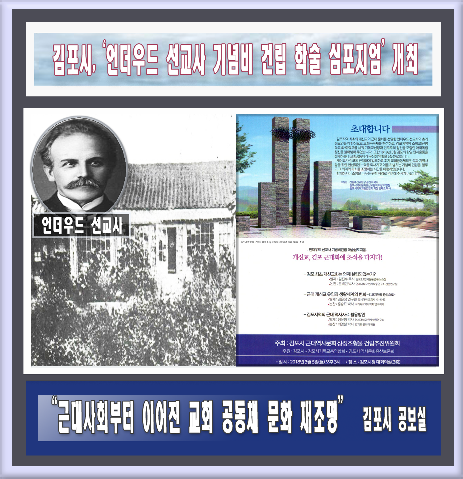 김포시 근대역사문화상징조형물건립추진위원회(이하 건립추진위원회)가 오는 3월5일 오후 3시 김포시청 대회의실에서 ‘언더우드 선교사 기념비 건립 학술 심포지엄’을 개최해 교회 공동체 문화를 재조명한다.