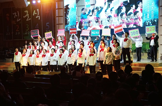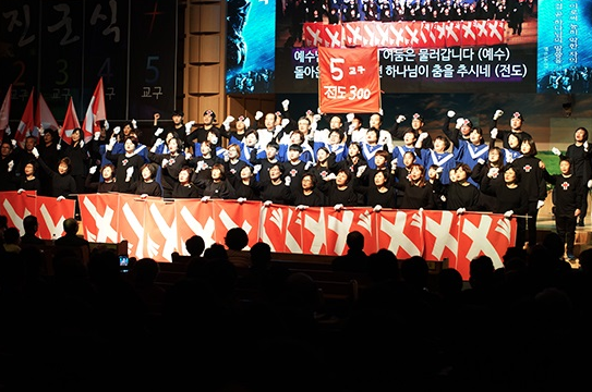 오후 6시 광명성전에서 펼쳐진 진군식에서 성도들은 전도에 대한 열정을 매우 뜨겁게 표현했다.