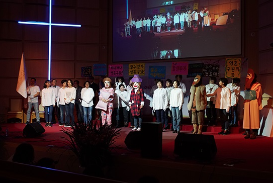 광명2교구는 퍼포먼스에서 변사(성우)를 활용해서 무대 위의 배우들의 몸 연기와 어울리게 표현했다. 이어 <성도들아 이 시간은>을 개사한 찬양을 했다.
