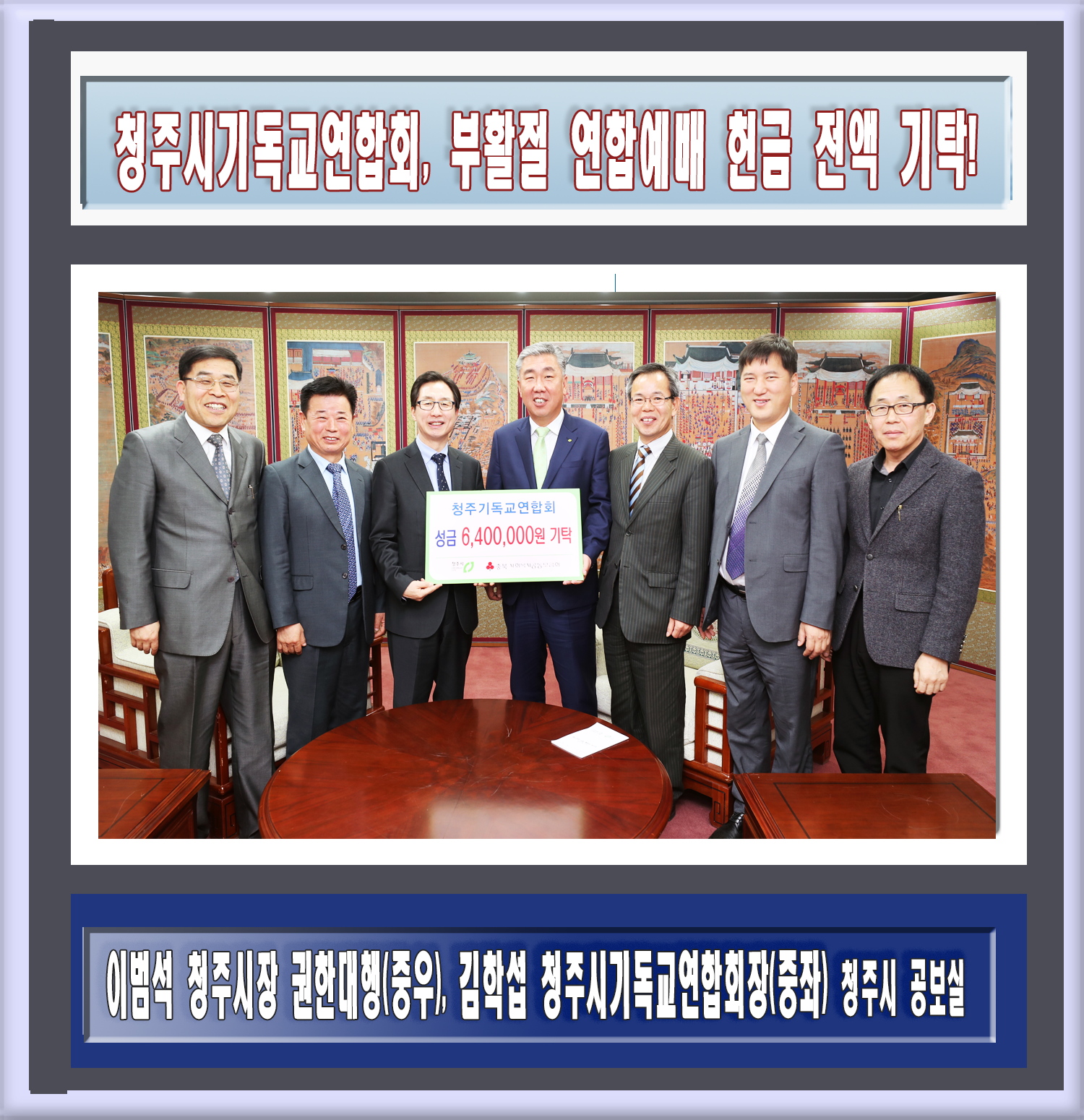 4월 1일 연합예배에서 모인 헌금 640만 원을 청주시 저소득층을 위해 기탁 "이범석 청주시장 권한대행, 김학섭 청주시기독교연합회장" |