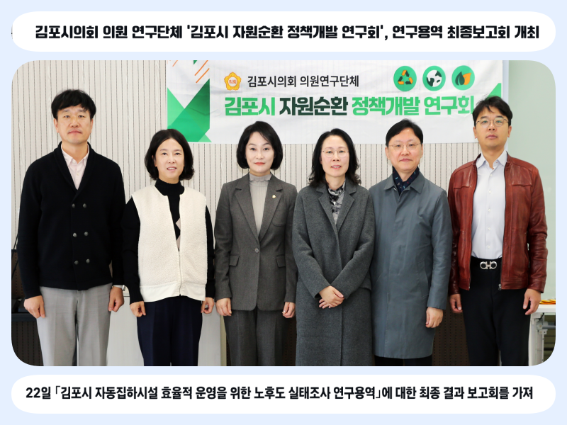 김포시의회 의원 연구단체 ‘김포시 자원순환 정책개발연구회’(대표의원 김현주, 이하 연구회)는 22일 「김포시 자동집하시설 효율적 운영을 위한 노후도 실태조사 연구용역」에 대한 최종 결과 보고회를 가졌다.